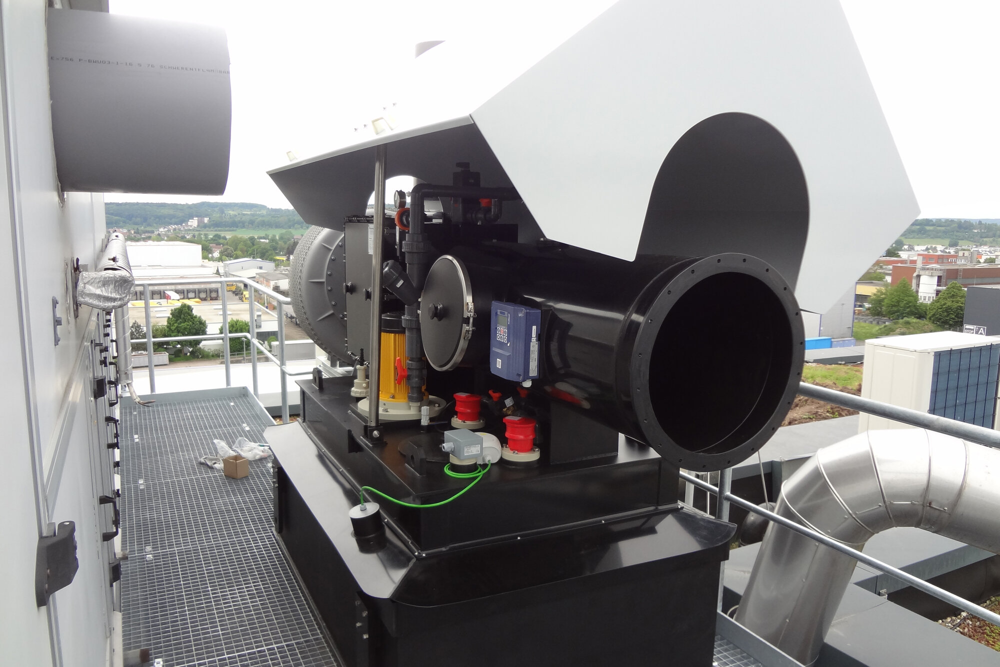 Aus Platzgründen musste der Abluftwäscher auf dem Dach der Firma Koos montiert werden. Für seinen Außeneinsatz wurde er entsprechend fit gemacht: Eine aufklappbare Schutzhaube aus pulverbeschichtetem Aluminium schützt vor Witterungseinflüssen. Das Gehäuse ist aus UV-beständigem Polyethylen und gut gegen Kälte und Hitze isoliert. Um die Temperatur des Waschwassers über dem Gefrierpunkt zu halten ist der Abluftwäscher zudem mit einer Badheizung mit Temperaturfühler ausgestattet. Die Frischwasser- und Abwasserleitungen verfügen ebenfalls beide über einer Begleitheizung. Zudem wurde darauf geachtet, dass Bauteile, die regelmäßig gewartet oder gereinigt werden müssen, durch große Öffnungen und eine entsprechende Anordnung gut erreichbar sind wie zum Beispiel der Tropfenabscheider.